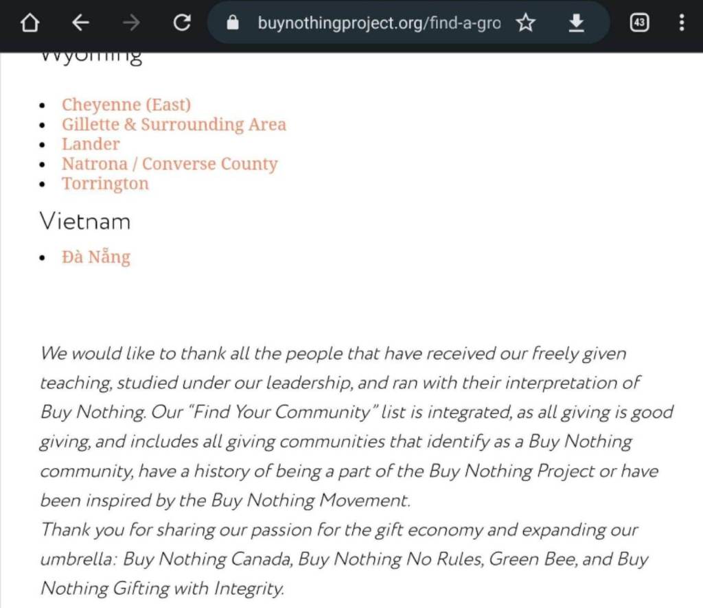 In case you’re wondering why Gifting With Integrity is down, it’s because Liesl Clark has reported Trademark Infringement. Even though Liesl Clark has given full permission for anyone to use Buy Nothing Project materials as long as there’s attribution. See images below. While we are hopeful that our old group will be restored, we have made a new group in the interim to continue providing support for everyone. Please join us here! https://www.facebook.com/groups/1177408692958759